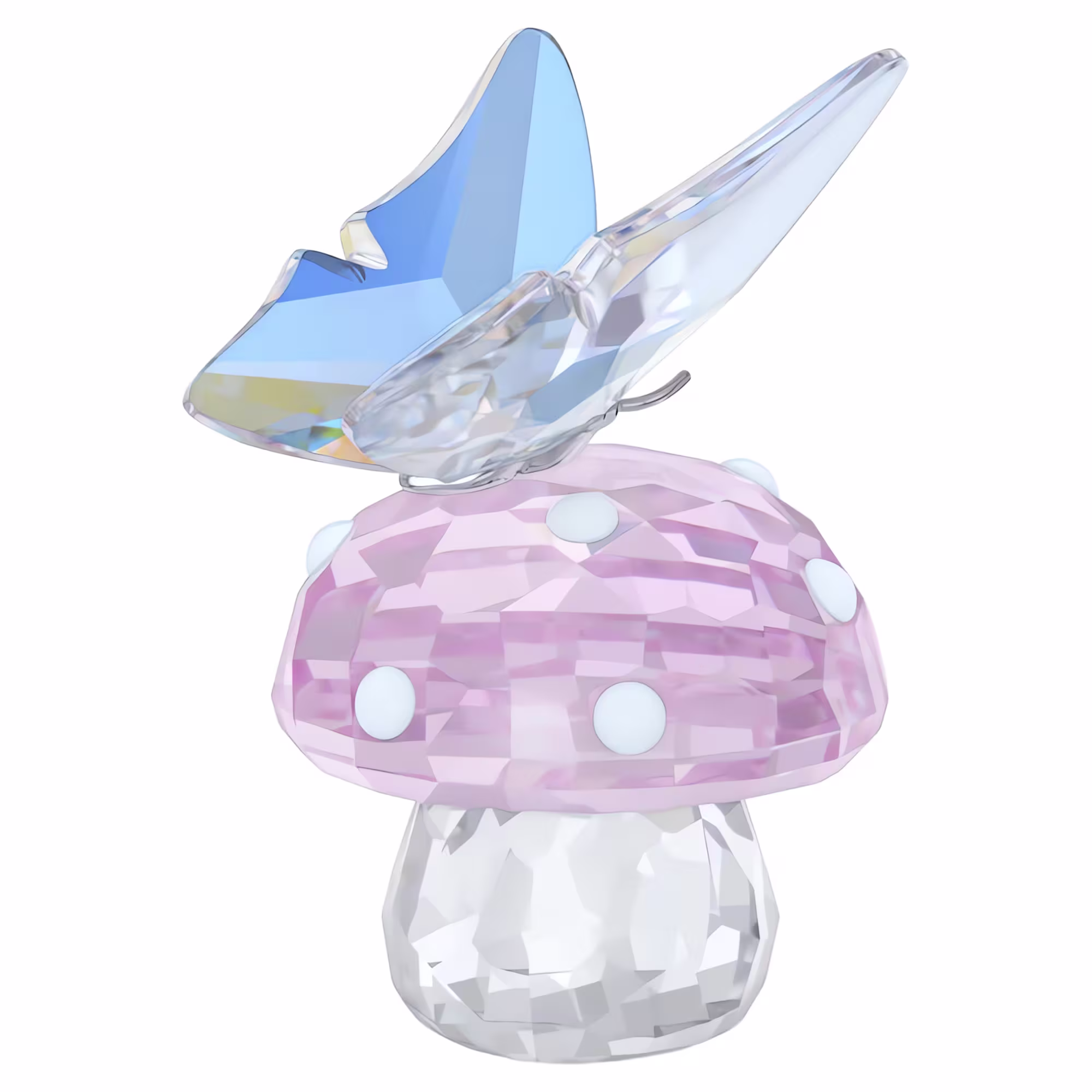 Captured in a sweet moment from nature, this decoration piece displays a butterfly landing on a mushroom. With a silver-tone plated metal body and glorious wings in the Aurora Boreale effect, the creation is further enhanced by the mushroom’s pink and white colorway with playful dots. Each of the 276 facets gives a wondrous reflection of light, creating an eye-catching piece for any interior space.