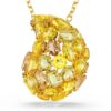 Doubling as both a pendant and brooch, this versatile creation delivers two pieces of vivid jewelry in one. The central motif is suspended from a delicate gold-tone plated chain and features a mesmerizing puzzle of crystal cuts in yellow and amber tones. It is emblematic of Gema’s unexpected formations and vibrant beauty, and glows even brighter when worn alongside matching jewelry pieces from the same family.