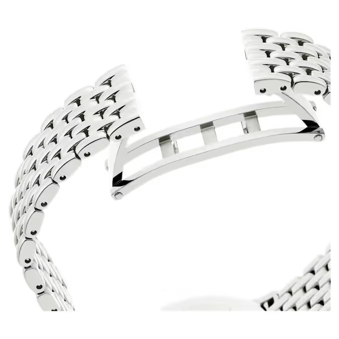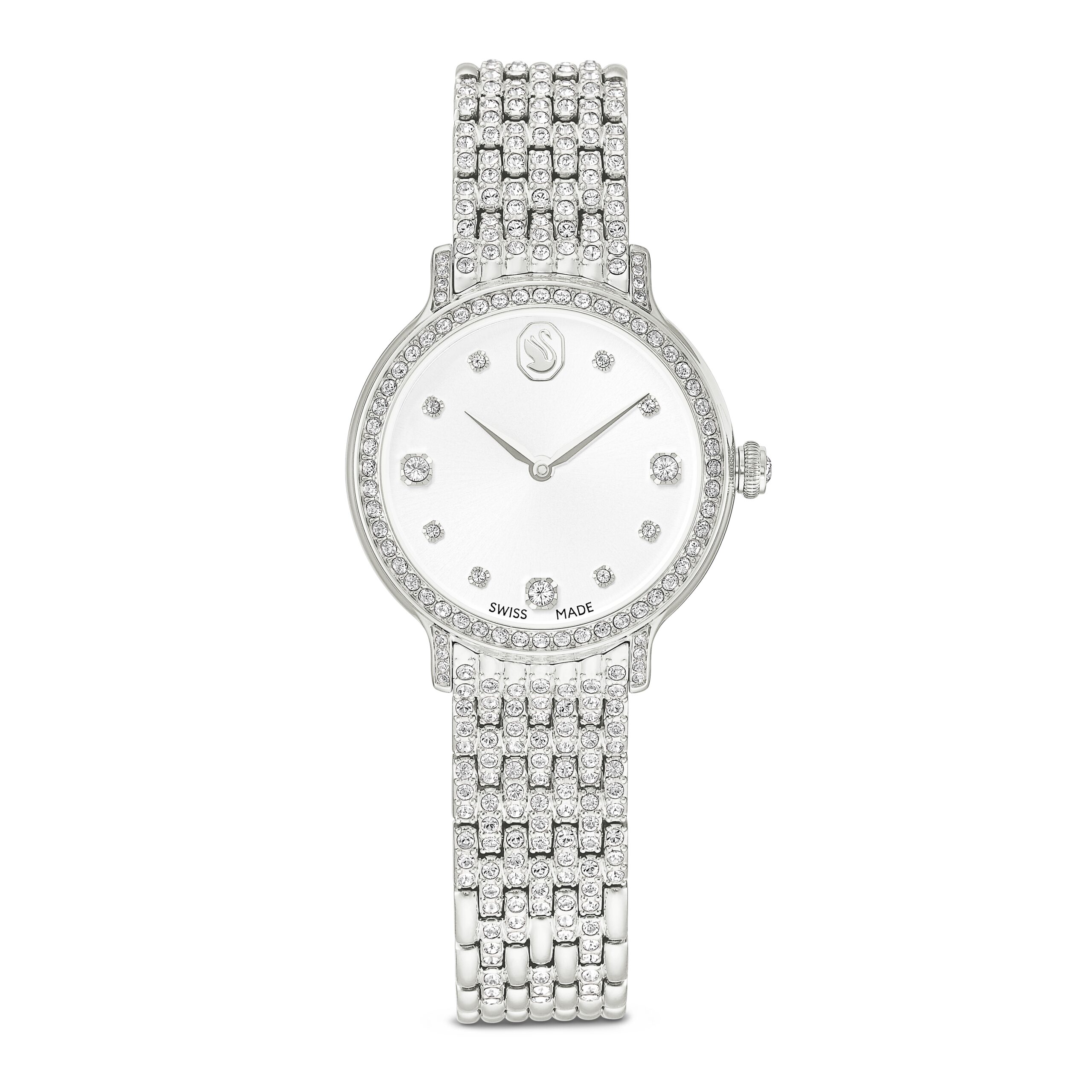 This 31mm timepiece is crafted in stainless steel and draws inspiration from the fusion of metal and crystals that defines the Imber jewelry family. The pavé bezel is set with 68 individual crystals, while another 198 crystals are used to decorate the seven-link bracelet. Extra radiance can be found on the sunray dial, with its gleaming surface accentuated by crystal index markers, while a sophisticated Swan emblem is placed at 12 o’clock. A choice that exudes glamour, this Swiss Made watch is water-resistant to 50m.