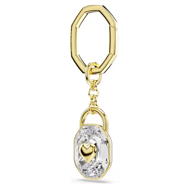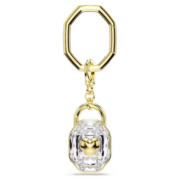Crafted in the shape of a padlock, this gold-tone plated keyring symbolizes enduring love and unwavering friendship. The luxurious design features an octagonal link, connected to a large clear crystal with a heart at the center. Gift this key ring to someone special to express your true feelings.