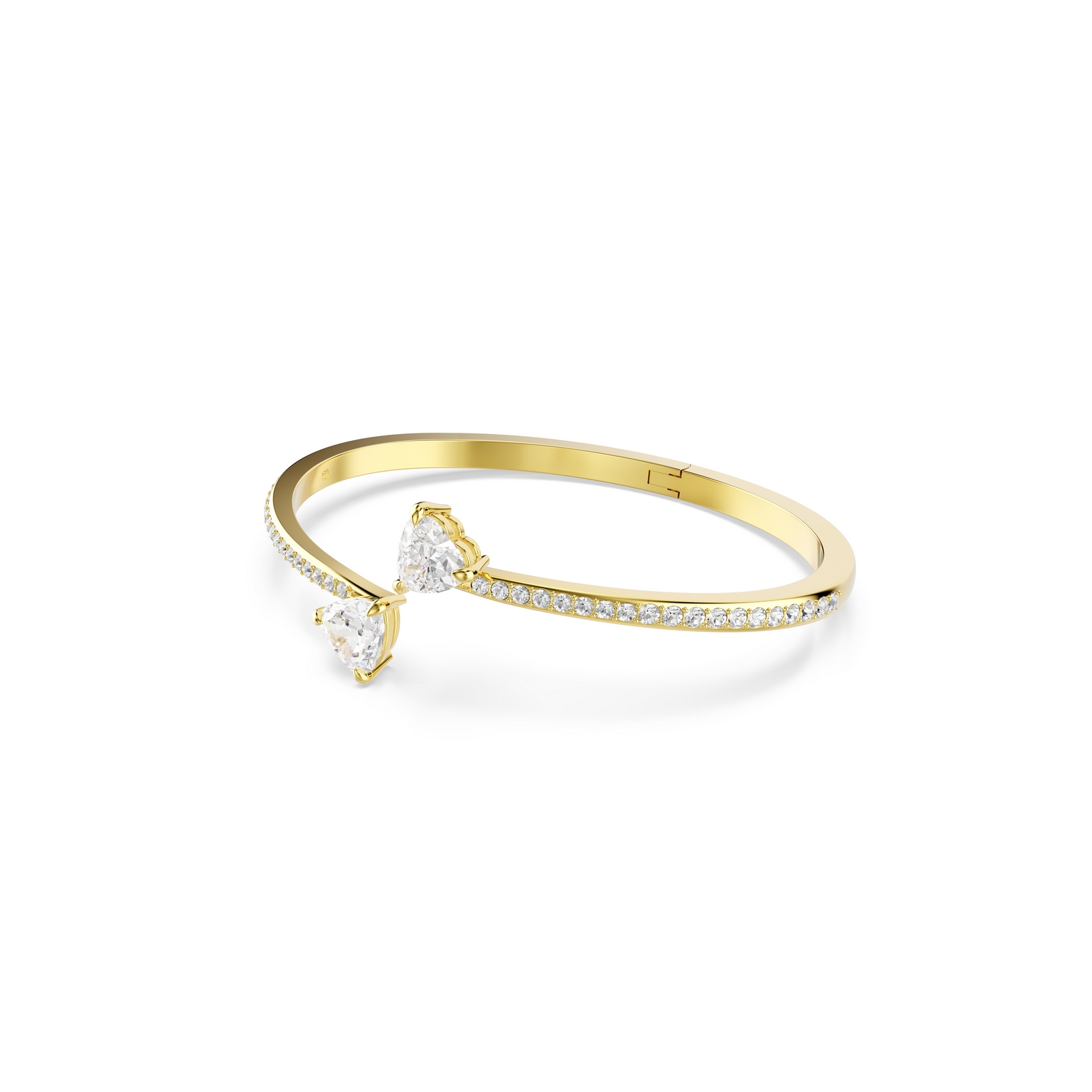 Artful simplicity and a hint of romance make this Swarovski bangle an ideal gift for someone special. The gold-tone plated design is supremely elegant and features two interconnecting heart-shaped Swarovski Zirconia as a centerpiece. A gorgeous gift for someone you adore.