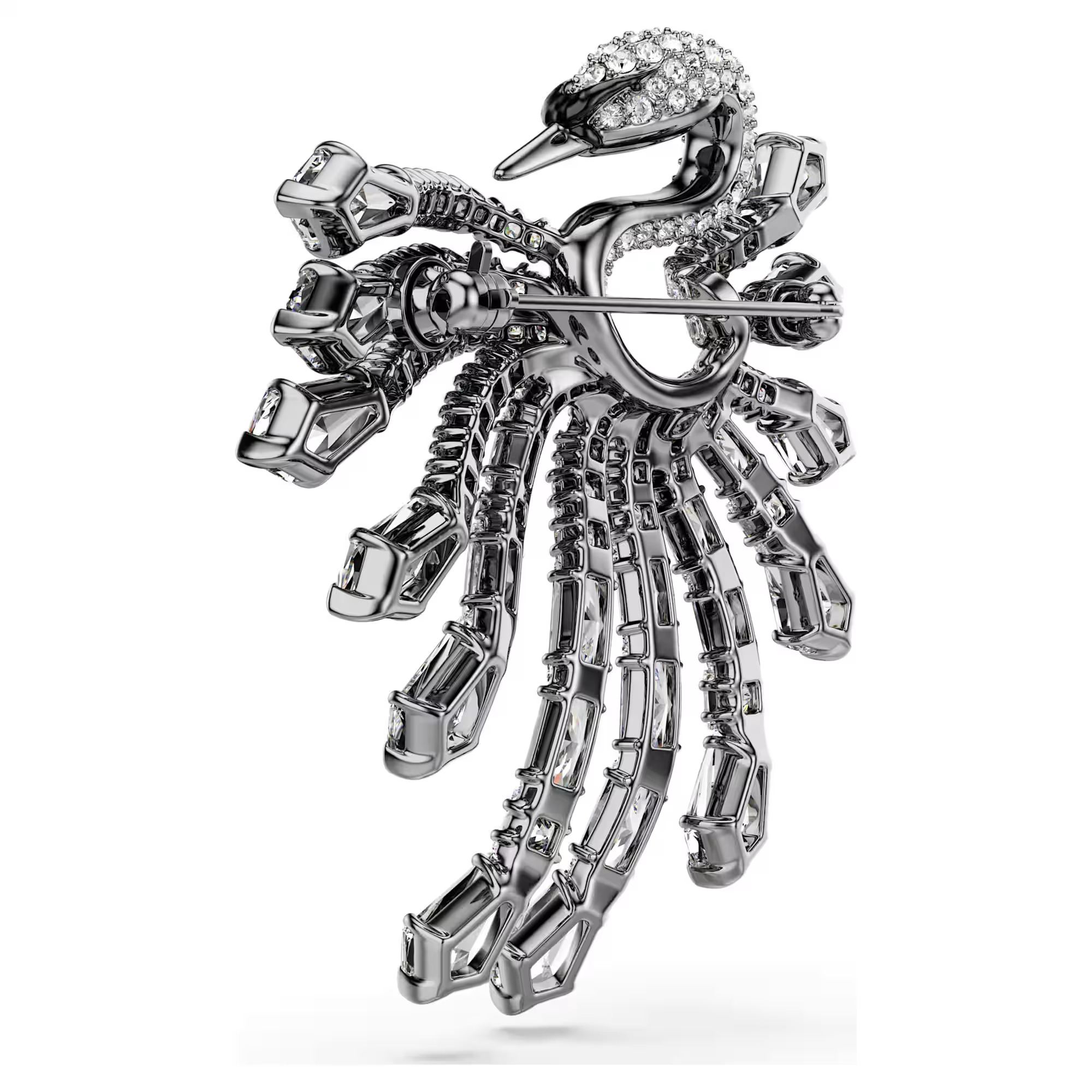 The Vienna Collection celebrates 130 years of creativity and savoir-faire at Swarovski. Honoring that heritage, this ruthenium plated brooch is inspired by the graceful neck and body of a swan. The design is decorated in clear crystals and Swarovski Zirconia, with feather-like strands that spread outward for a dramatic effect. A beautiful statement piece to convey sophistication, this brooch is a wondrous tribute to Swarovski’s iconic mastery of light. Wear it together with the matching ear cuff to maximize the bold effect.